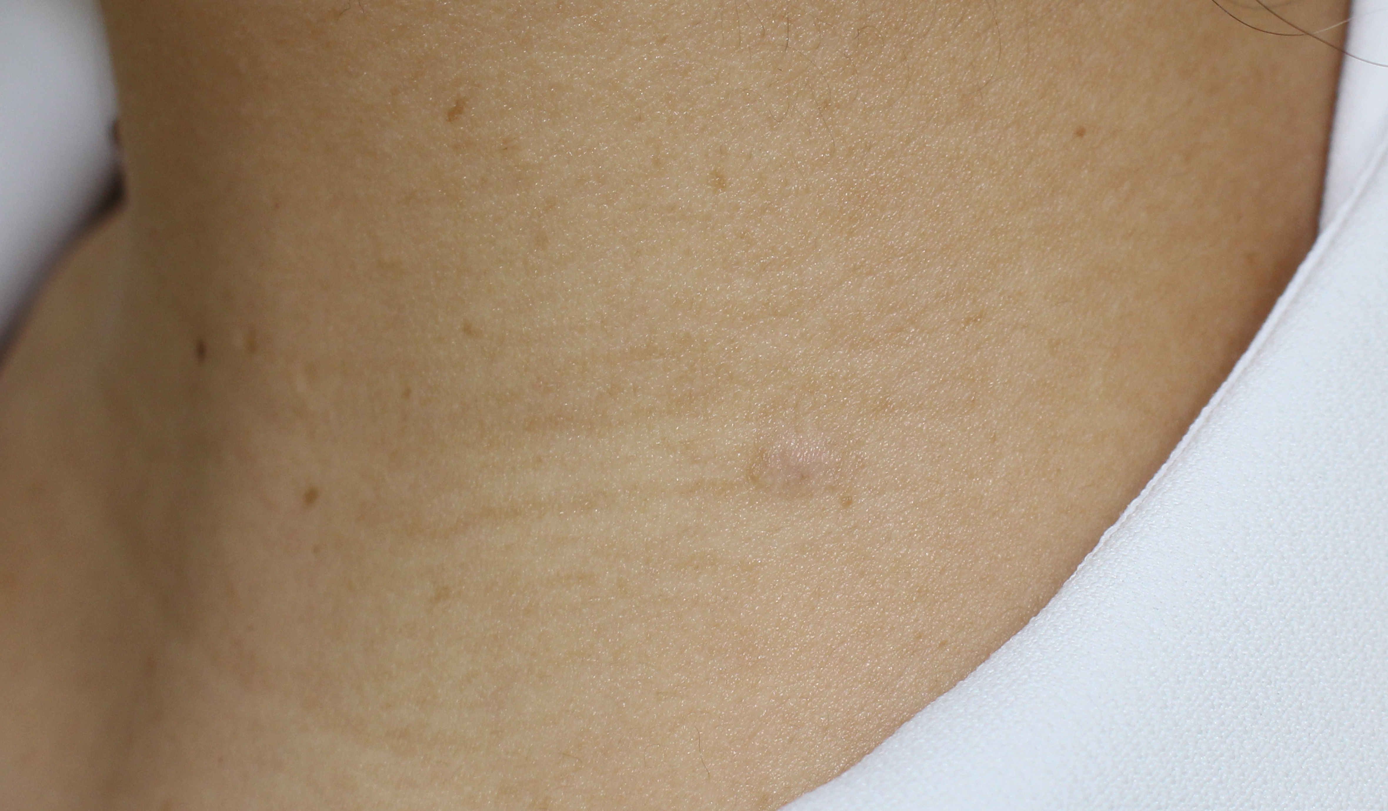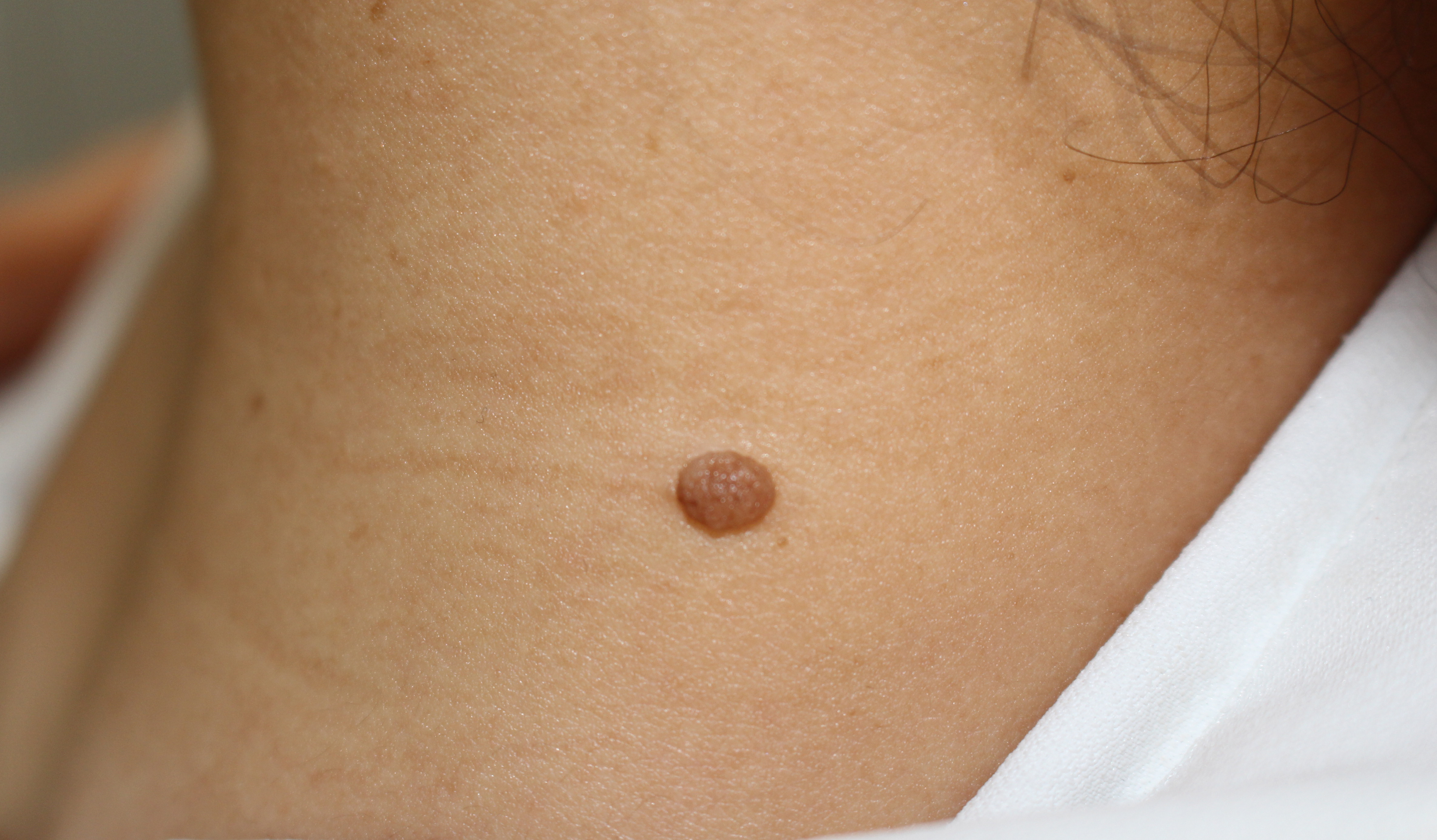 首の後ろにある、ふくらみのあるほくろ(約5mm)をCO2(炭酸ガス)レーザーで除去しました。アフターの写真は1か月後です。
